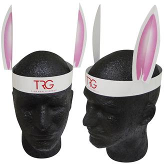 Rabbit ears hat made from high density paper board liquid laminated for a high gloss finish. Quick turn, just ask. Includes preprinted stock graphics. Your custom imprint displays prominently on the front of the headband. A unique addition to any costume.